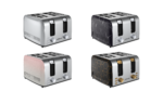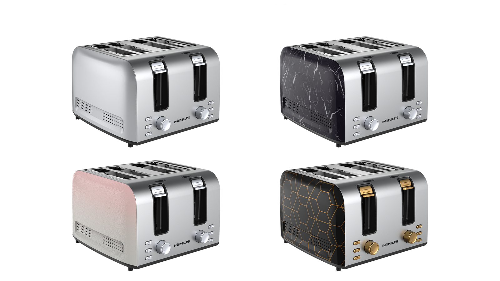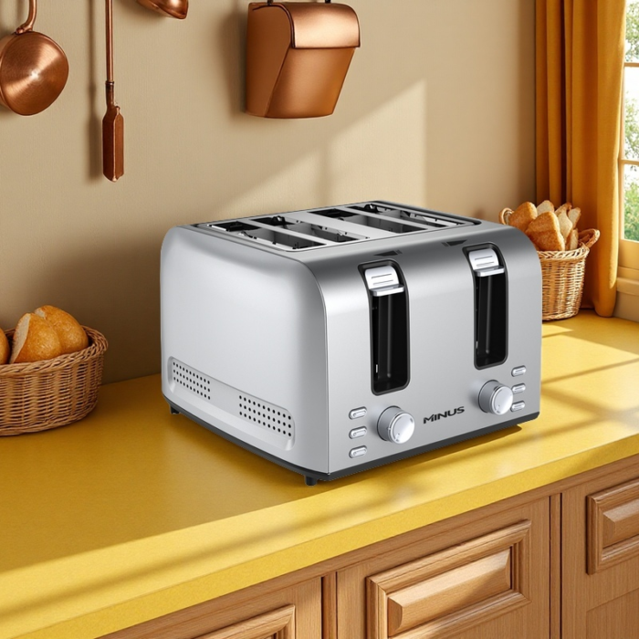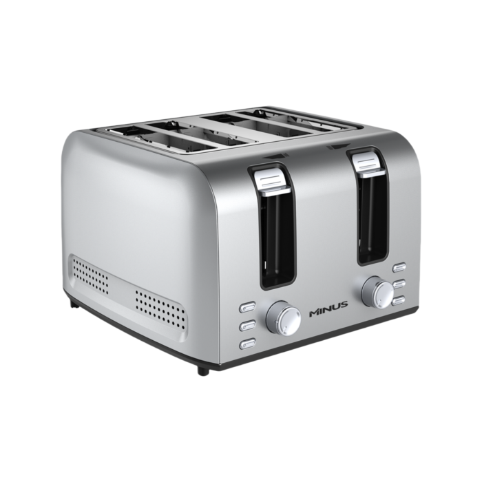 Minus 4-slice toaster with crumb tray, automatic pop-up and cord storage, supporting 7 settings.