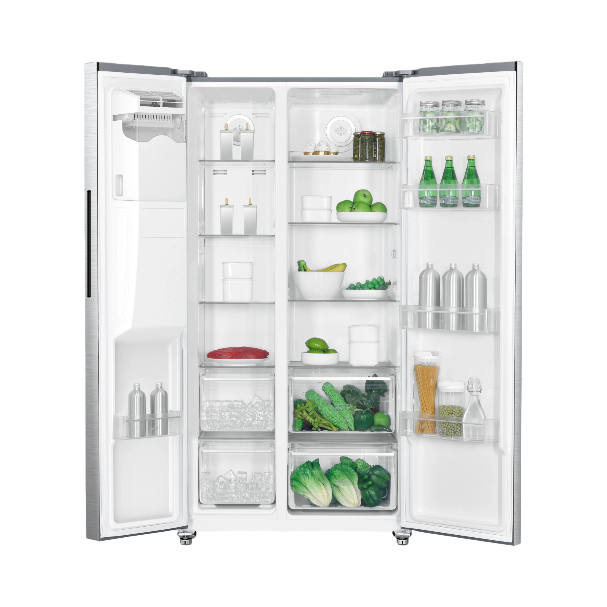Side-by-side fridge freezer,no frost, glass shelf, on-door HMI, 2 drawers+ 2 crispers, recessed handle, inox