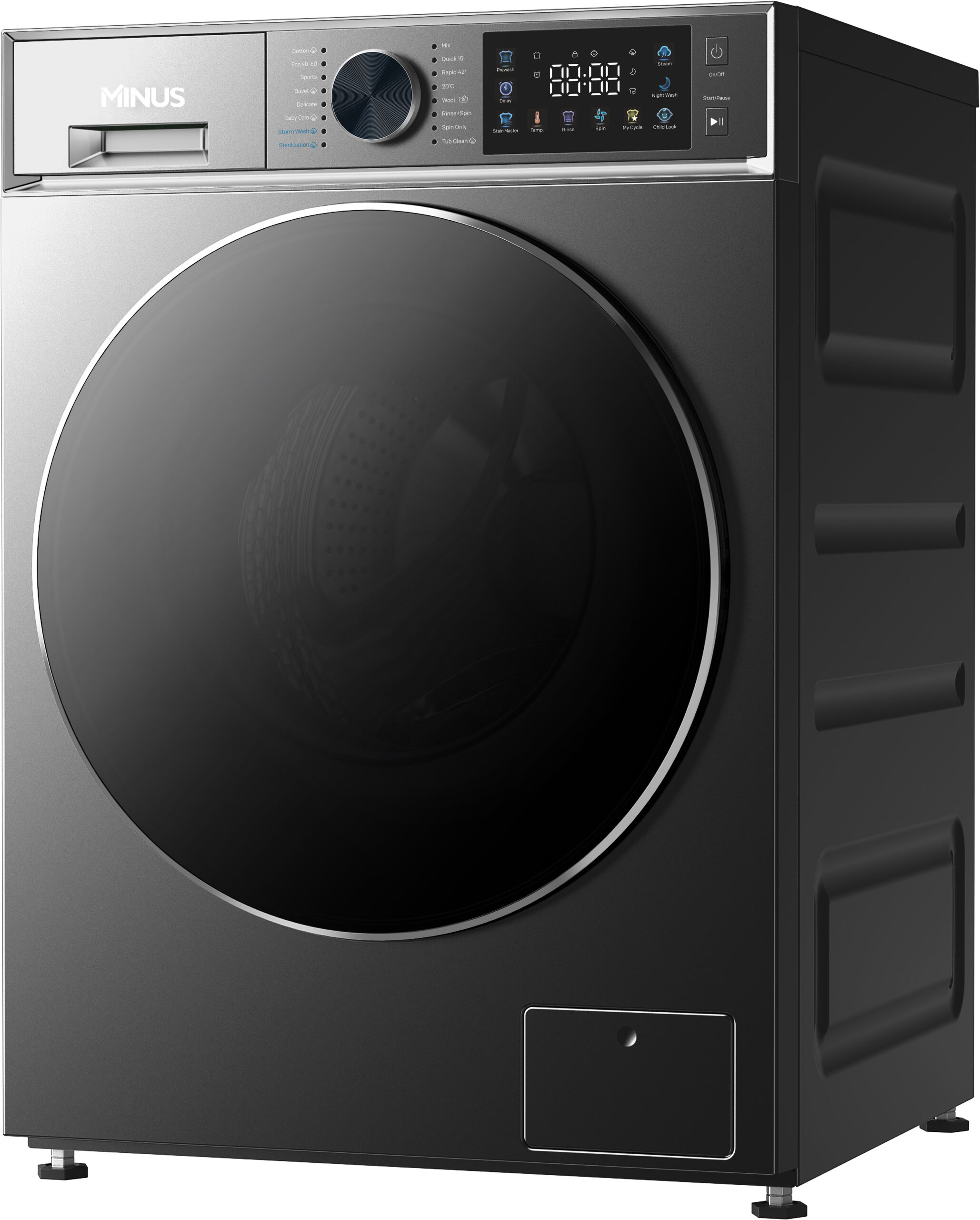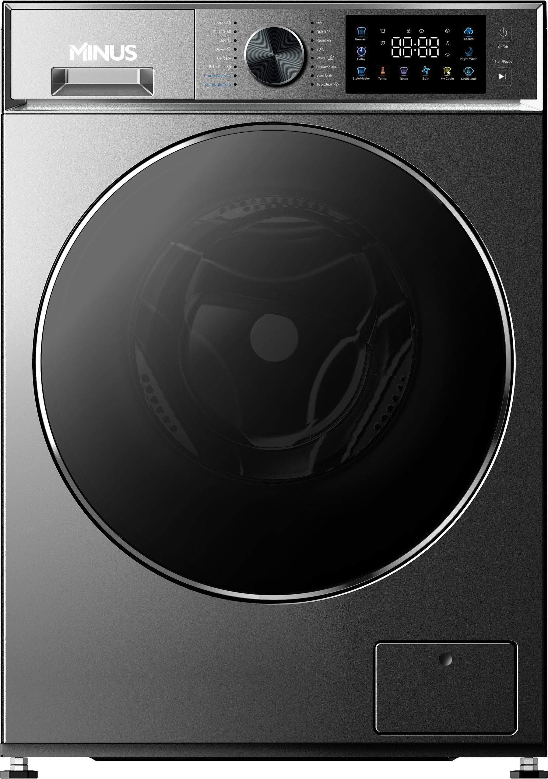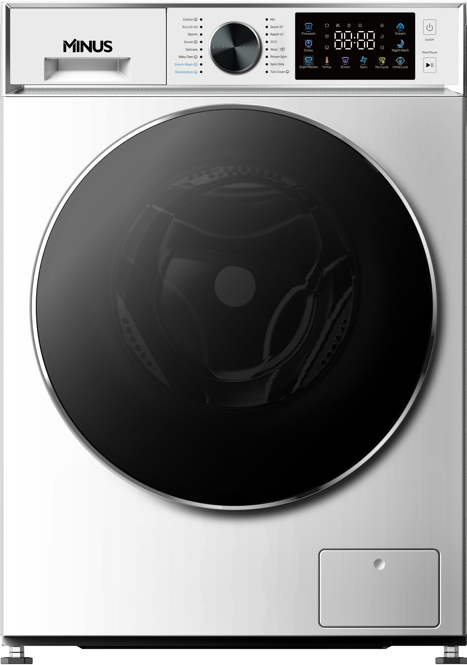 Front loading washing machine, digital display, touchable colorful buttons, tub clean, night wash, quick wash, 16 programs with light indicator, steam program, predelay, prewash, double layer black door with chromed rim, black knob, White.